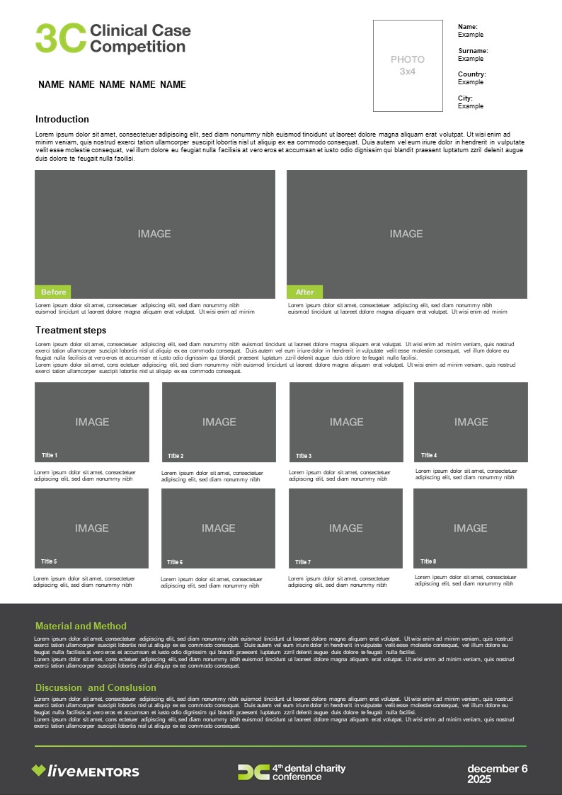 - Posterlərin qiymətləndirilməsi zamanı müalicə planının aydınlığı və məntiqi ardıcıllığı, onun klinik etibarlılığı və uyğunluğu əsas meyarlar kimi götürüləcək. Eyni zamanda, müalicənin mürəkkəbliyi, hazırlanmış ortopedik konstruksiyaların keyfiyyəti, sənədləşmənin detallılığı və vizual təqdimatın (piksel, qrafika və ümumi görüntü keyfiyyəti) səviyyəsi də nəzərə alınacaq.